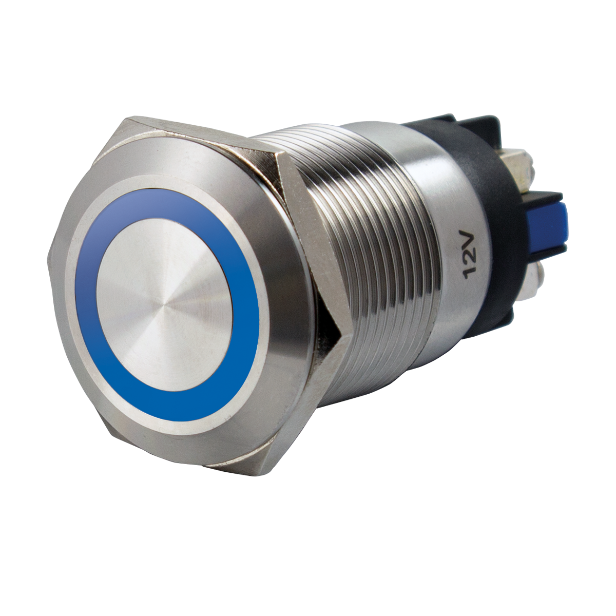 Bouton poussoir acier inox diam. 19 mm Halo bleu 12V AC/DC Contact NO